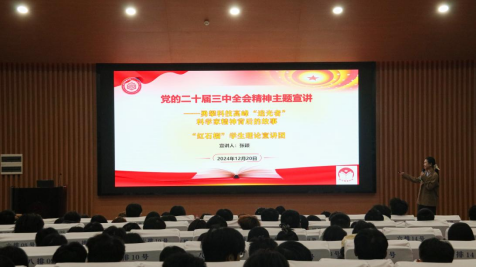 12月20日,我院特邀马克思主义学院“红石榴”学生理论宣讲团开展“党的二十届三中全会精神及传承红色基因、学思践悟中国共产党人精神谱系”主题宣讲,活动在武鸣校区椭圆形报告厅举行。会议由宣讲团张颖、殷本胜、吴星霏宣讲。学院团委学生会全体干部、学院第三期青马工程骨干班学员、入党积极分子、党员发展对象及新发展团员参加此次宣讲。
