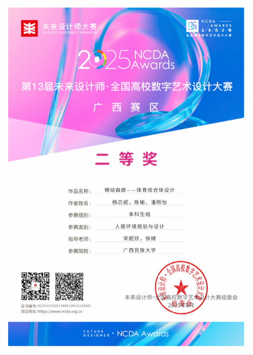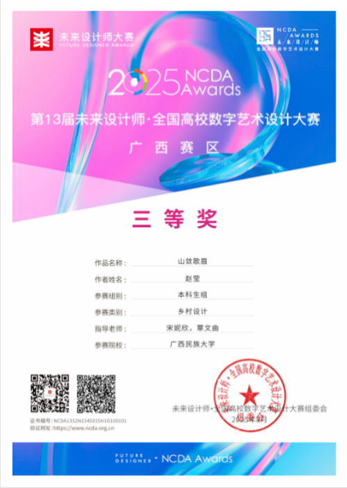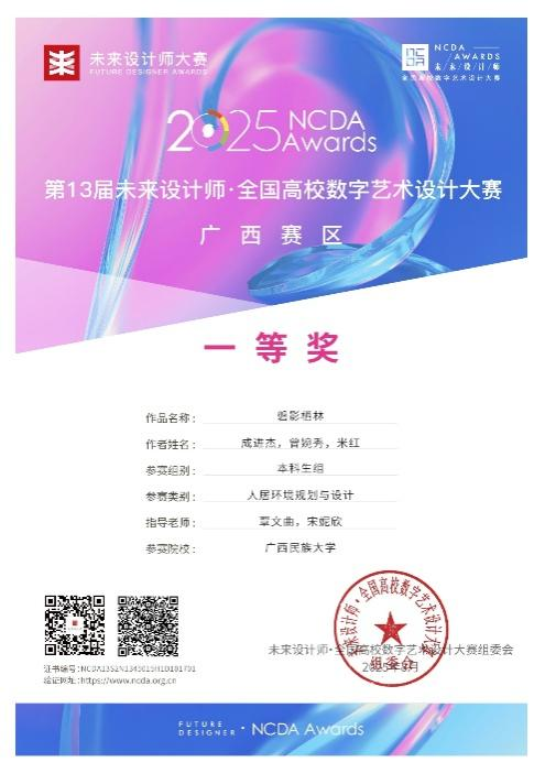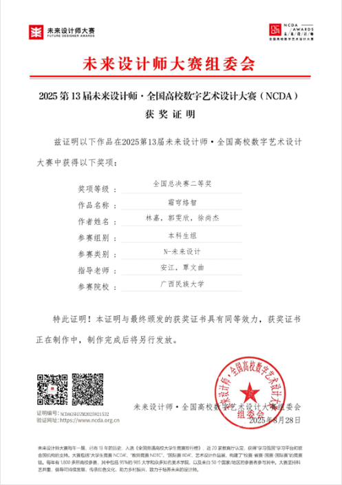 在刚刚落幕的2025年第13届未来设计师·全国高校数字艺术设计大赛(NCDA) 中,广西民族大学betway必威西汉姆联学子表现卓越,不仅在广西赛区荣获4项一等奖、1项二等奖、1项三等奖,更在全国总决赛中勇夺全国一等奖1项、二等奖1项、三等奖1项的优异成绩,充分体现了我院在数字艺术设计教育和创新人才培养方面的显著成效。