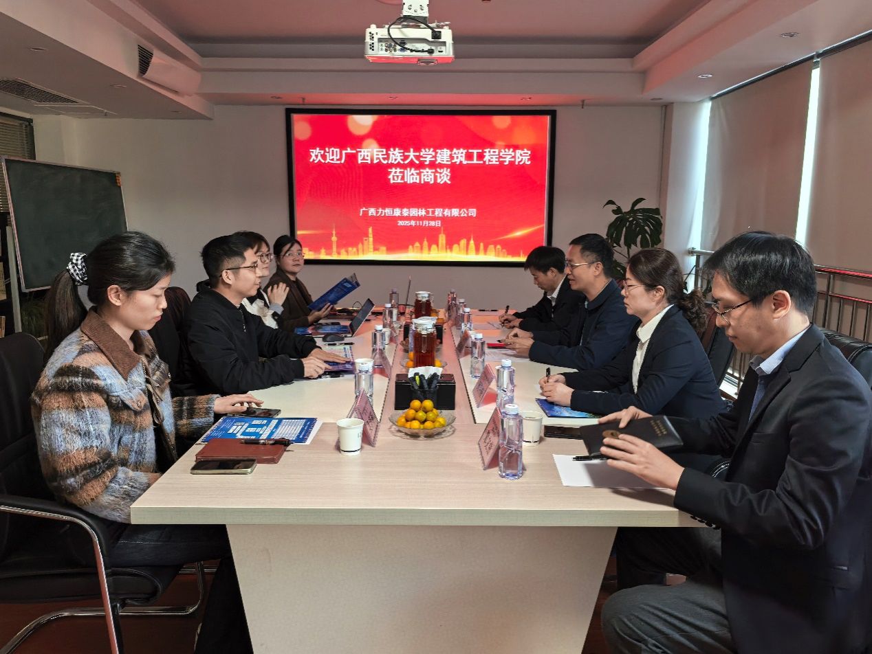 为深入贯彻落实国家稳就业、保就业决策部署,积极响应高校访企拓岗专项行动要求,深化校企产学研融合,精准对接行业人才需求,为 2026 届毕业生拓展优质就业渠道,11 月28日,我院党委书记覃祖聪带队前往广西力恒康泰园林工程有限公司开展调研交流与合作洽谈。副院长周月娥、组织员刘桂青、学院办公室、建筑系负责人陪同调研。