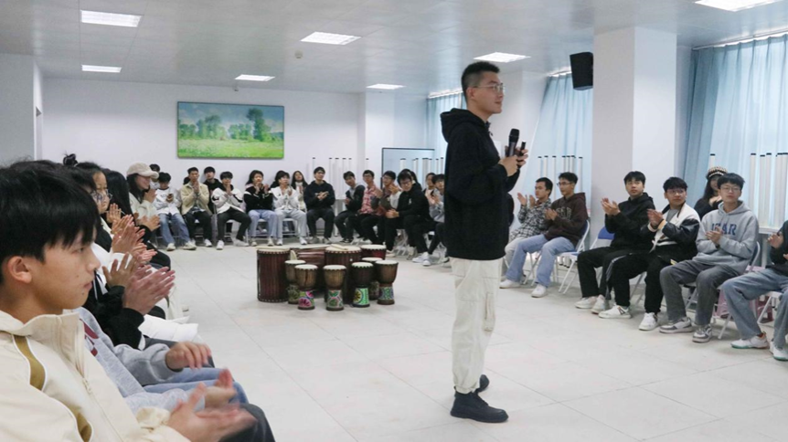 活动开始后,在老师的引导下,同学们将凳子围成两个同心圆,面对面依次进行聆听与诉说,相互之间用言语表达赞赏,现场气氛活跃而有趣。随后进入鼓圈体验环节,同学们每人手持一件乐器,在李凯的指导下进行合奏。接下来是陶笛演绎,陈雯吹奏出动人心弦的旋律,同学们沉浸在美妙的音乐中。最后的音乐想象环节,在灯光关闭后,李凯以声音传达指令,同学们闭眼跟随,放松身心。