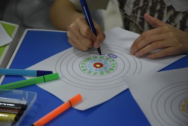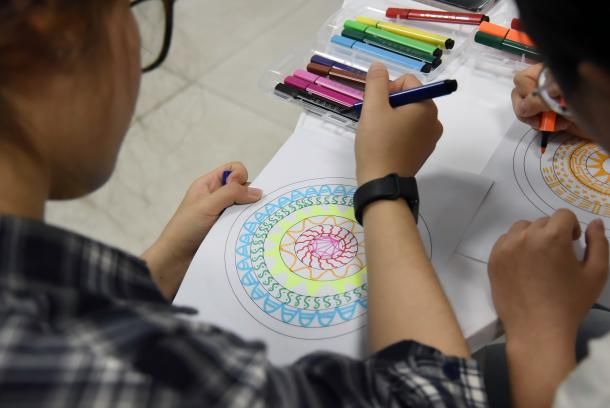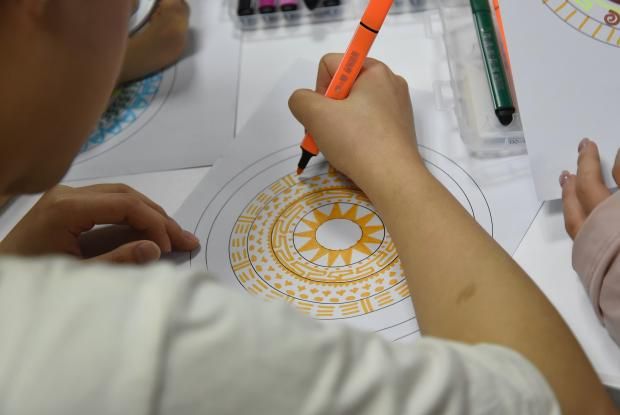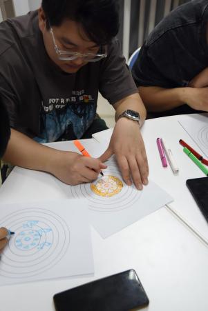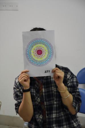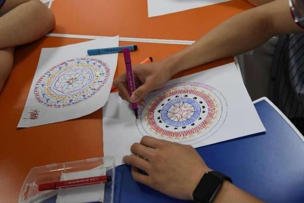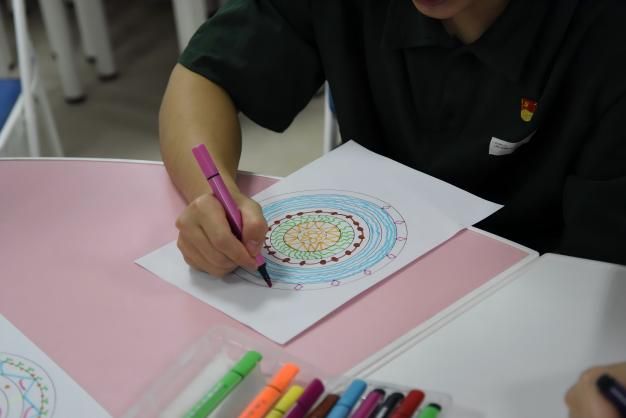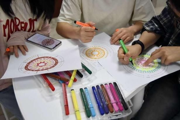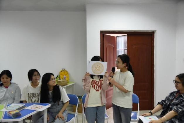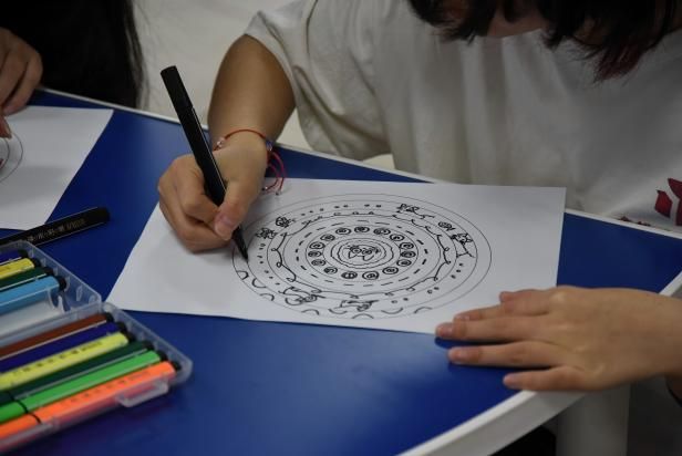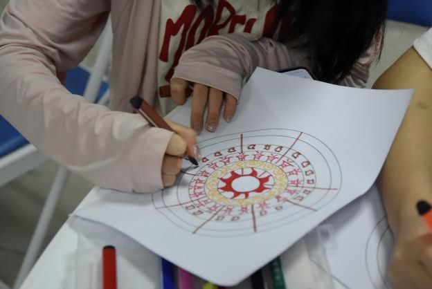 结合壮族非遗铜鼓文化,党员们在主题音乐的浸润中进行“铜鼓曼陀罗”绘画创作。活动邀请到材料与环境学院辅导员、“和你‘艺’起”艺术疗愈工作室成员玄濮睿老师带领学生党员学习壮族铜鼓纹饰文化,并引导创作属于自己的铜鼓纹饰。铜鼓纹饰作为壮族文化的瑰宝,蕴含着丰富的历史和文化内涵。党员们在绘制过程中,深入了解太阳纹、蛙饰纹等纹样所代表的自然崇拜、祈愿丰收等寓意,感受到中华民族文化的多元一体和博大精深。