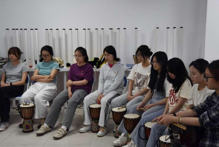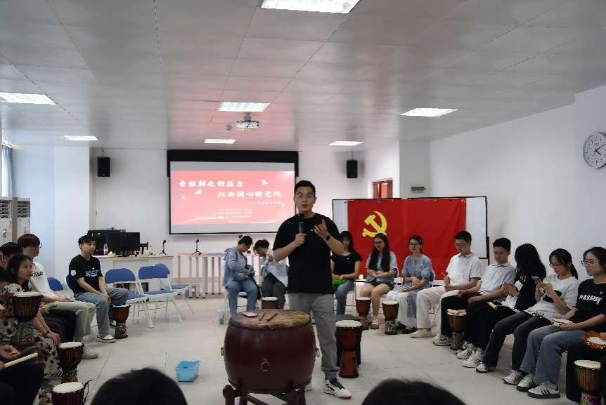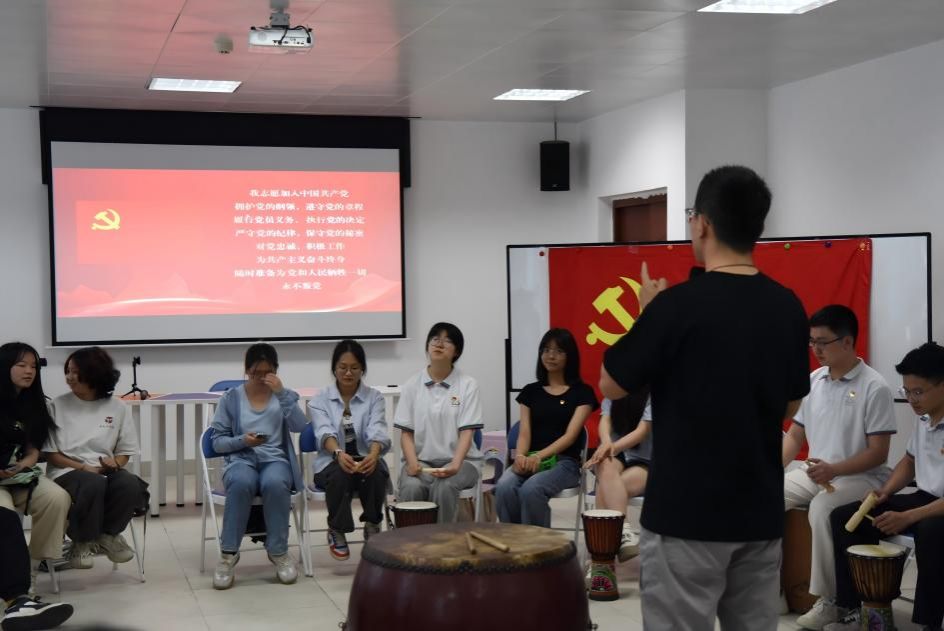 在“鼓圈引领”环节,党员们围坐成圈,手持非洲鼓、铃铛等打击乐器,在李凯老师的指挥下即兴创作节奏演奏。随着鼓点从零散到统一,参与者逐渐感知“个体节奏融入集体共鸣”的协作理念。“起初各敲各的有点乱,后来在老师的引导下自然而然形成合力,就像只有在党组织的领导下我们所有人信念一致才能凝聚战斗力。”学生党员在活动后感慨。这一环节通过沉浸式体验,生动演绎了基层党组织“团结-协作-攻坚”的行动逻辑。