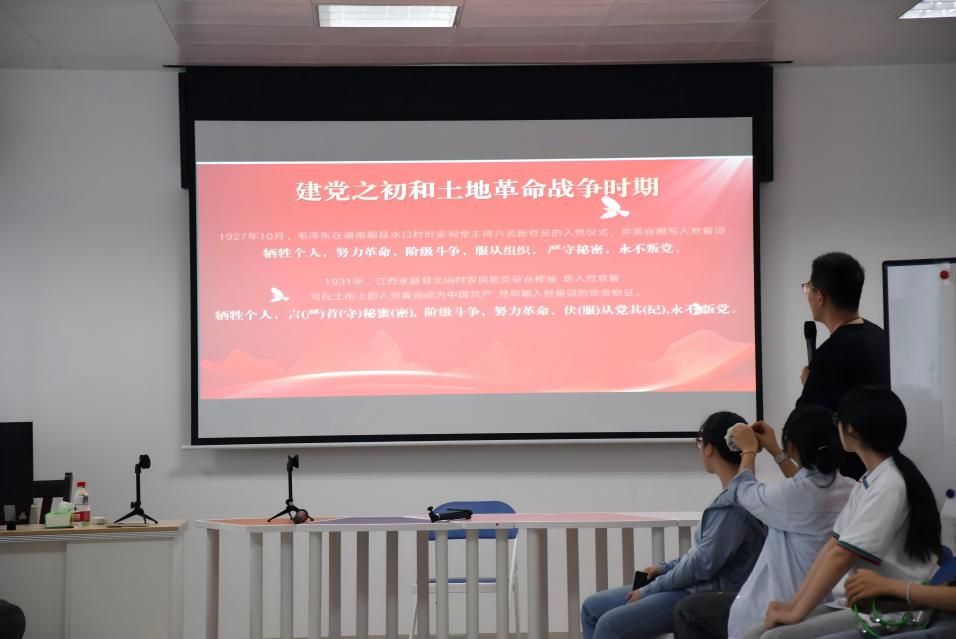 “我志愿加入中国共产党……”歌曲《我宣誓》的旋律响起,学生党员们以音乐形式重温入党誓词,闭目聆听并深入思考入党誓词的内涵,进一步学习了入党誓词的百年变迁,回顾自己的入党初心。随后的《义勇军进行曲》讨论中,通过历史回顾与歌词分析结合,大家共同再现了革命先辈开创新中国的波澜壮阔的画面。