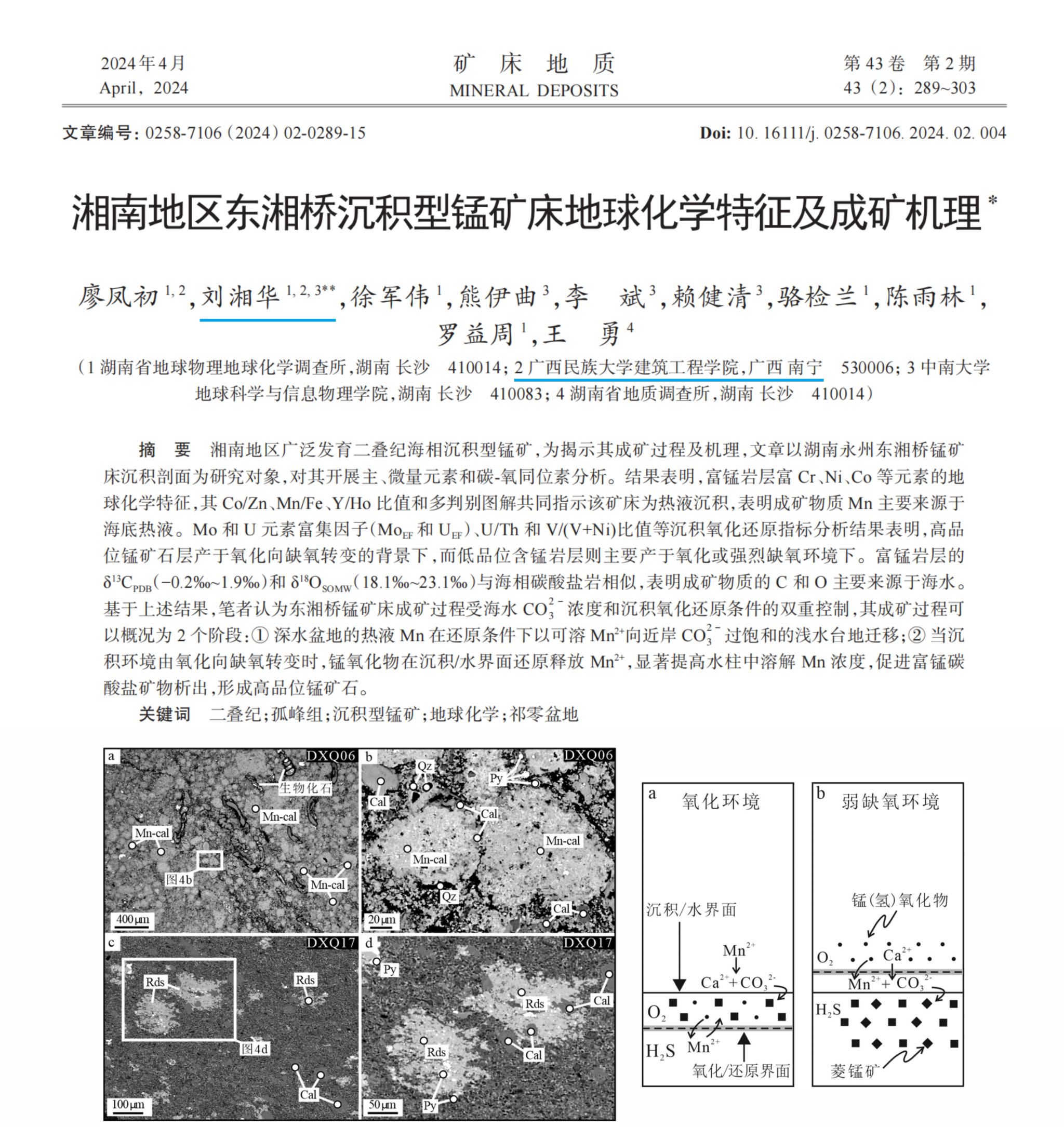 该研究成果依托我院与湖南省地球物理地球化学调查所联合开展的横向科研项目“湘南地区东湘桥锰矿沉积地球化学及矿床成因研究”,以祁零盆地东湘桥锰矿床为研究对象,通过扫描电镜、主微量元素及碳-氧同位素分析等技术手段,揭示了二叠纪海相沉积型锰矿的成矿机理,提出成矿过程受海水CO₂浓度和沉积氧化还原条件双重控制的新观点,为该区域矿床研究提供了重要参考。