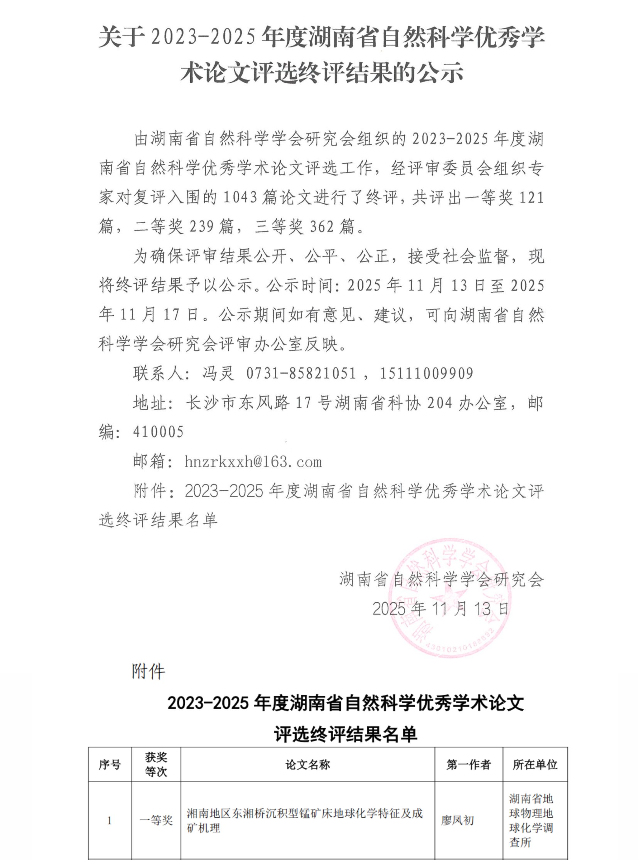 近日,2023-2025年度湖南省自然科学优秀学术论文终评结果公示,betway必威西汉姆联岩土力学与地质过程团队刘湘华老师作为通讯作者的学术论文《湘南地区东湘桥沉积型锰矿地球化学特征及成矿机理》荣获一等奖。