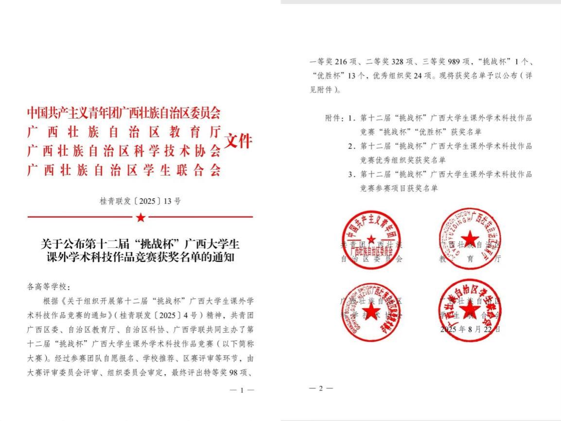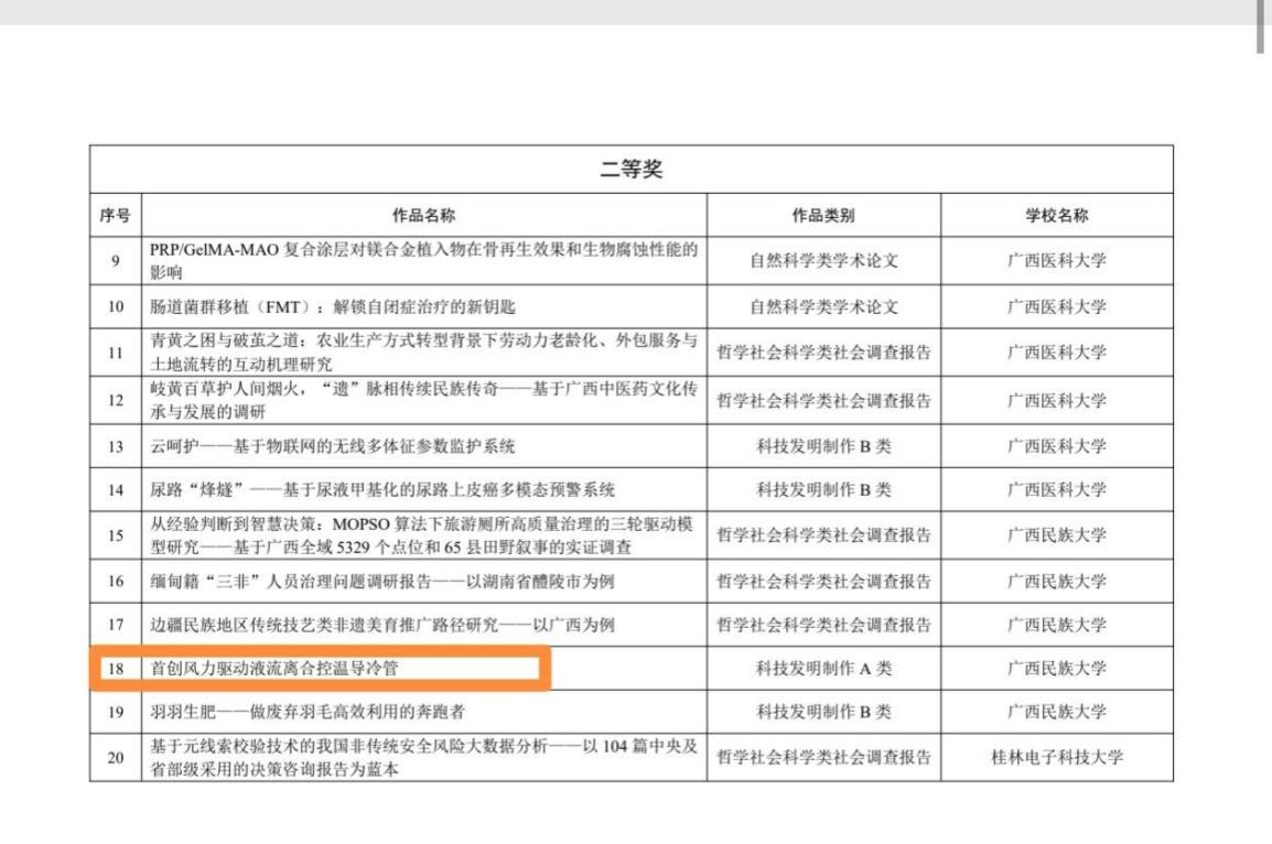 近日,第十二届“挑战杯”广西大学生课外学术科技作品竞赛结果揭晓,betway必威西汉姆联参赛团队凭借原创项目“首创风力驱动液流离合控温导冷管”荣获科技发明制作A类二等奖,为学院科技创新成果再添重要荣誉。